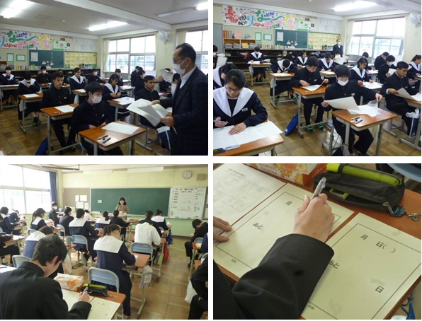 16日(水)から始まった3日間の3年生卒業テストが本日18日(金)終了しました。 下の写真上段は、1限目のテストの問題を解く3年3組生徒の様子です。写真下段は、3限のテストが終了した4限目、卒業に向けたカウントダウンカレンダーを作成する3年2組生徒の様子です。 とりあえず、本日で卒業テストは終わりましたが、来週は私立高校の入試が続きます。インフルエンザの流行の兆しもみられるので、まずは健康に留意し、栄養と睡眠を十分とって、ベストコンディションで入試に臨んでほしいと思います。