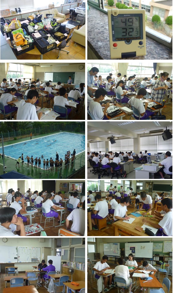連日、猛暑が続いています。昨日も岐阜県多治見市で気温が40℃を越え、各地で熱中症患者が増えていることなどがマスコミで報道されました。四日市市も昨日の最高気温が35℃を越え、本日19日(木)も午後3時ごろには34℃になると予想されています。 本校では、本日の朝の学活で生徒が持参した弁当を預かって冷房の効く職員室で保管しています(写真左上)。また、本日6限目に予定していた大掃除を5限目に繰り上げました。 下の写真右上は、本日1限目の3階中央階段水道付近の湿度と気温の様子です。写真2段目以下は本日1限目の各学年の教室等の様子です。