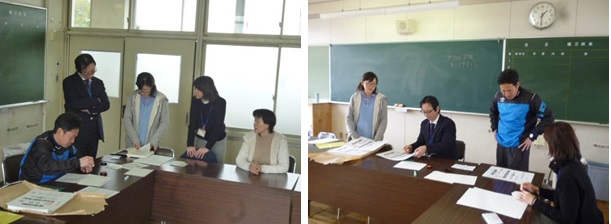 下の写真は、学年末テスト1日目の昨日27日(水)の午後、1年生担当の先生が、卒業証書の準備・押印・確認等の作業を行っている様子です。