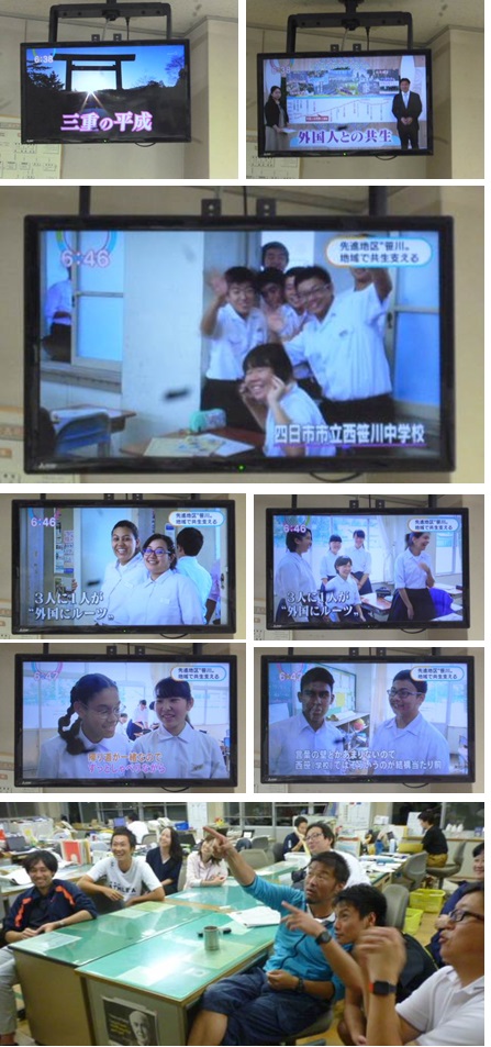 昨日11日(木)18:30~NHKテレビ「まるっと!みえ」で、外国につながる生徒と日本人の生徒が一つの教室で普通に教科授業を受け、一緒に昼食を取り、楽しく休み時間を過ごしている本校の様子が紹介されました。先生たちも職員室のテレビで番組を視聴しました。 なお、多文化共生サークルも「みんなの防災セミナー2018」に向けた防災迷路づくりやセミナー当日の様子について取材を受けましたが、残念ながら時間の関係で放映されませんでした。