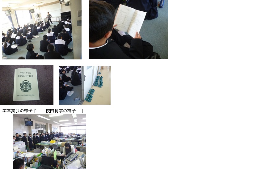 本日11日(木)、1~5限目は学活を中心とした学年内授業を行いました。その中で、1年生は1限目に視聴覚室で学年集会を行いました。学年集会では、生活の手引きを用いて学年の担当教師より学校生活について説明を受けました。視聴覚室に入るにあたり、スリッパは、きちんと並べられ整頓されていました。西笹川中学生として必要な力を一つずつ身に着けていますね。