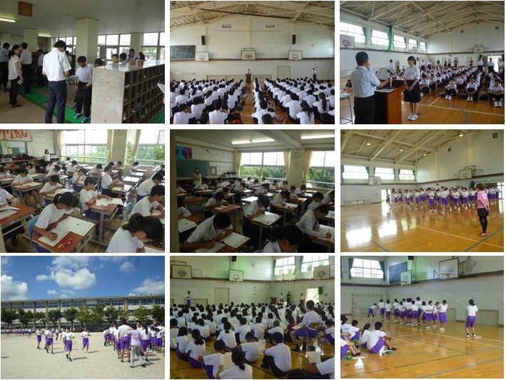 今日3日(月)から2学期がスタートしました。始業前にはおはよう点検(写真:上段左)があり、1限目の始業式では校長先生からの話と中体連大会等の表彰伝達を行いました(写真:上段中右)。 2限目からは1・2年生は確認テスト(写真:中段左中)、3年生は学年集会と体育祭の取り組み等を行いました(写真:中段右)。 また、5限目には、避難訓練(写真:下段左)を行ったあと、体育館で生徒集会を開き、生徒会本部役員、代議員から体育祭の生徒会種目(大縄)の競技内容やルールなどについて実演を交えた説明がありました(写真:下段中右)。 さらに、帰り学活後には、体育祭リーダー会議を開き、全校パフォーマンスについて説明・練習等もありました。