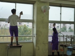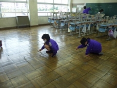 普段の掃除の時間には、なかなか手が出せない細かいところや、掃除しにくいところなどを中心に、念入りに,ていねいに、1時間かけて掃除しました。窓のサン、隅っこのホコリ、水垢などを雑巾でふき取り(上の2枚)、床板の隙間に詰まったホコリを穿(ほじく)り出し、きれいに掃いて水ぶきをしてワックスをかけました(下の2枚)。