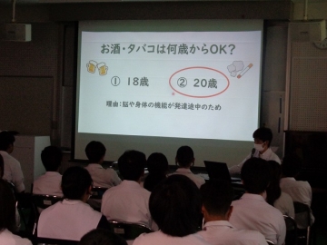 学校薬剤師の方から、20歳になる前にタバコを吸う&お酒を飲むことの危険性、絶対に手を出してはならない違法薬物、そして最近若者の間で広がっているオーバードーズ(薬の過剰摂取)について、とてもわかりやすくお話ししていただきました。
