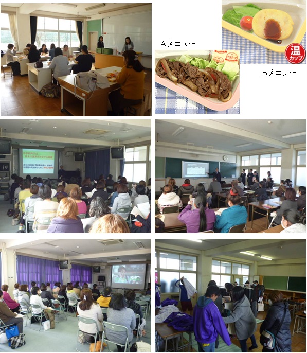 本日24日(木)の午後、新入生保護者対象入学説明会を開催しました。 まず、12:30から希望者を対象に、被服室で中学校デリバリー給食試食会を行いました。本日は全国学校給食週間となり、Aメニューは、シシリアンライス(マヨネーズ)(佐賀)、野菜の五色あえ、いももち(北海道)、牛乳、Bメニューは、ゼリーフライ(埼玉)、ゆでキャベツ、ミニトマト、野菜の五色あえ、いももち(北海道)、白飯、牛乳、つぼん汁(熊本)でした(写真上段左中右)。 その後、13:15から日本語保護者向けと外国語保護者向けに分けて、入学説明会とスマホ・ケータイ安全教室を交互に行いました(写真中段左右、写真下段左)。 また、15:30からは必要な児童にも来校してもらい、制服採寸、スリッパ・体育館シューズ等のサイズ合わせを行って、終了となりました(写真下段右)。
