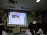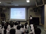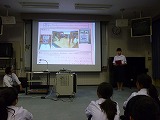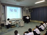 5日の総合的な学習の時間に、「誰もが過ごしやすい町づくり」についての学年発表会を行いました。各クラスの代表の3名の人たちが学年全員の前で発表をしました。代表者の人たちは学級発表の時よりも内容をさらに充実させて、大きな声で人に伝わる話し方で発表することができました。また、聴いていた学年の仲間も「わかりやすい話し方ですばらしかった。」「写真や絵などがあってよくわかった。」などの発表者の良い点についての感想を多く発表することができました。今後はこの取り組みを文化祭で発表する予定です。