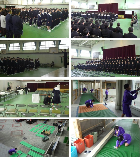 いよいよ、明日、3月7日(木)は卒業式となります。 本日は1限目に3年生の卒業式練習、3,4限目に全校でのリハーサルをしました(写真上2段中左右)。また、午後からは1,2年生で校舎内外の清掃や式場準備をしました(写真下2段左右)。 卒業式当日の日程は次のとおりです。 なお、職員玄関前は来賓駐車場となり、校舎北側も駐車可能台数が限られています。学校周辺道路は駐車禁止ですので、ご理解をいだき違法駐車等のないようよろしくお願いします。 8:30 在校生登校 8:50 卒業生登校(教室へ入る)、保護者受付開始(体育館玄関) 9:05 在校生入場 9:15 保護者入場完了 9:20 来賓入場 9:30 卒業生入場(入場開始時刻=卒業式開始時刻) 11:15ごろ 卒業生退場(各教室へ)