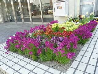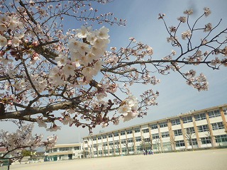 運動場の桜は、あと少しで満開です。職員玄関横の花壇にもたくさんの花が咲いています。