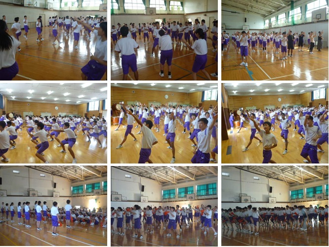 今週5日(水)から全校パフォーマンスの全体練習がスタートし、本日7日(金)で3日目となりました。6限目に体育館で全体練習(写真:上段左中右)を行い、その後、男子パートは武道場(写真:中段左中右)、女子パートは体育館(写真:下段左中右)でそれぞれパート別の練習を行いました。 わずか3日間の練習ですが、各生徒のダンスや演技の動きの習得は早く、何よりもリズムに乗って楽しみながら、そして全力で踊っている生徒が多いことが素晴らしいと思います。