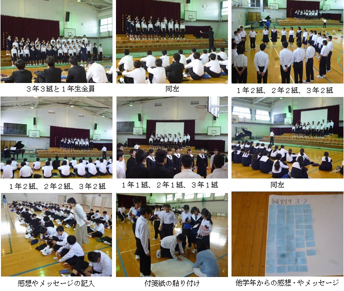 1限目に3年3組と1年生全員、3限目に1年2組、2年2組、3年2組、5限目に1年1組、2年1組、3年1組がそれぞれ体育館に集まってお互いに学級合唱(1限目の1年生は学年合唱)を発表し合い、他学年の同じクラスへ感想やメッセージを付箋紙に記入して模造紙に貼り付けました。