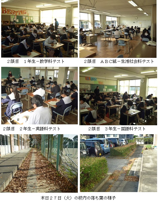 本日27日(火)は2学期末テスト2日目です。各学級では、昨日と同様に張り詰めた雰囲気の中で、生徒がテストに取り組んでいました。