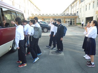 朝、学校から出発前に取った集合写真と、3年2組の生徒がが見送ってくれた画像をアップします。