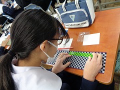 本日の家庭科では、畳べりを使用した「小物づくり」がスタートしました。畳の素材で物をつくるのは、畳の香りと共に温かい気持ちになります。これから、個々人のセンスを活かした小物が出来上がるのが楽しみです。