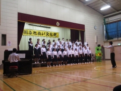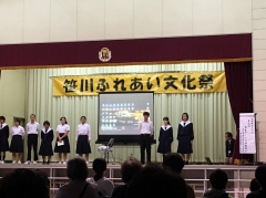 本日、笹川小学校にて、「笹川ふれあい文化祭」が開催されました。西笹川中学校からは、3年生学年合唱と多文化共生サークルが発表しました。 3年生は、文化祭で発表した「青葉の歌」を合唱しました。この曲は、きらめく青葉の描写を通して世界の平和や人類愛を訴える歌詞により、メッセージ性の強い作品となっています。3年生だからこそ歌えるこの曲を、地域の皆さんに聴いていただくことができました。 多文化共生サークルは、活動報告とPRを行いました。夏祭りや防災訓練など、「地域住民のみなさんとととも歩むサークル独自の活動」をみなさんにPRすることができました。