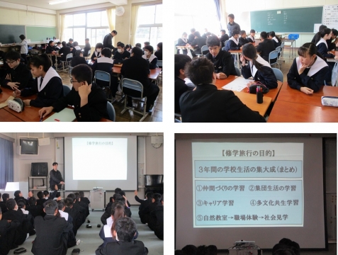 1限目から班替えを行い、修学旅行での班が決まりました。3限目には修学旅行のオリエンテーションがあり、5月14(火)~16(木)のおおまかな日程や施設についての説明を受けました。東京や横浜の写真に歓声があがる場面もあり、多くの人が楽しみにしていると感じられました。楽しみにするのは良いことですが、修学旅行は「学習」であることを意識し、明日からの調べ学習を有意義なものにしていきましょう。