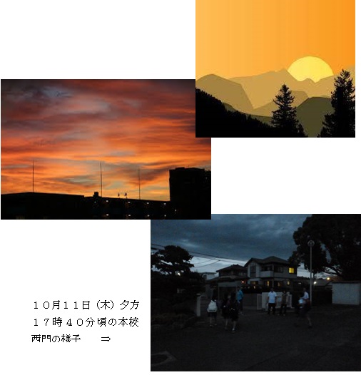 今年度の中体連新人大会は来週末の10月19日(金)~20日(土)に行われますが、例年に比べて大会日程が約1週間遅いために日没時刻が早まり、部活動終了時刻17:30、下校完了時刻17:45では日が暮れて周りが暗い状態になります。特に、雨天等の場合は余計に早く暗くなります。 そこで、来週の15日(月)から新人大会前日の18日(木)まで下校時刻を15分早めて、部活動終了時刻17:15、下校完了時刻17:30とします。新人大会に向けて時間をかけて練習したいところですが、安全面を考えて以上のように実施しますので生徒の皆さんも急いで、そしてできるだけ複数で下校しましょう。