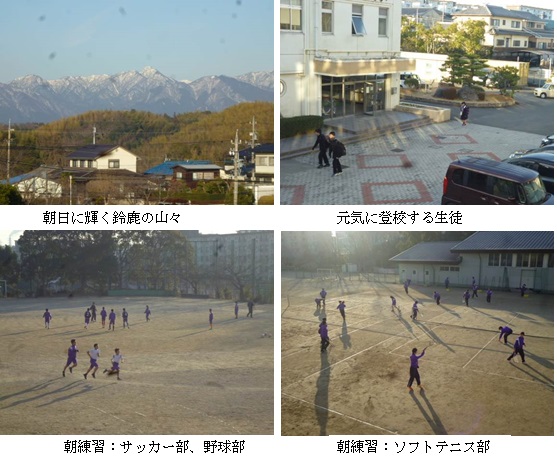本日30日(水)の朝も冷え込み、鈴鹿の山々は朝日を浴びて白く輝いていました。そんな中、元気に登校し、部活動の朝練習に励む生徒の姿が見られています。
