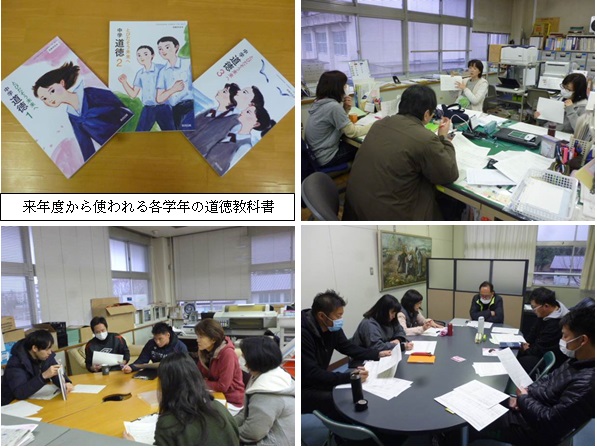 今回のテーマは、来年度から始まる「特別の教科-道徳」についての内容とし、すでに採択が決まった教育出版の各学年の道徳教科書『とびだそう未来へ 中学道徳』を使って、各学年での年間指導計画や評価等について研修を行いました。