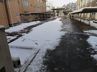 校区内の通学路は、まだまだ積雪により自転車通学に不安を感じるところも一部ありますが、学校周辺では本校教職員のみなさんが、6時30分頃から雪かきをしていただいたことによって、学校周辺の通学路、自転車置き場も、職員玄関周辺も安全に通学ができるようにしていただきました。