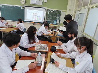 現在2年生では「人権学習」に取り組んでいます。昨日2月10日(火)6限目の2年5組の授業は人権学習に取り組みました。本来は、2月3日(火)に大池中学校教員研修会の提案授業として実施する予定でしたが、インフルエンザ感染拡大に関わる学級閉鎖により延期となっていた授業です。