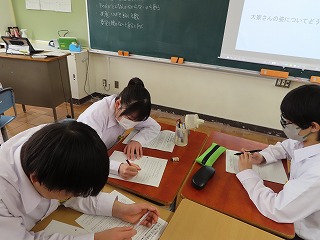 2組の子どもたちは、突然に提示された2つの和歌についてびっくりしながらも、教科担当の先生の説明に納得し、隣の人や近くの席の人たちと意見交流をしながら探究活動に取り組む時間を頑張っていました。