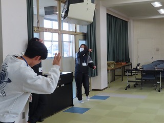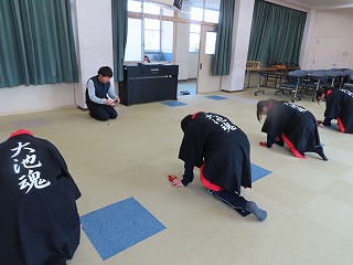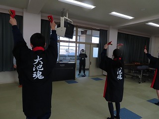 本日2月12日(木)の2限目。校舎北館3階の視聴覚教室からは、軽快なダンス曲と鳴子(なるこ)の音が聞こえてきます。8組の子どもたちが、明日2月13日(金)の午前中に開催される「第39回 三泗小・中学校特別支援学級学習発表会」に向けて、仕上げの練習を、担任の先生と一緒に集中して取り組んでいました。この2限目は、交流学級の授業参加している子どもたちもいることから、写真では4人での活動になっていることを申し添えます。