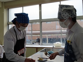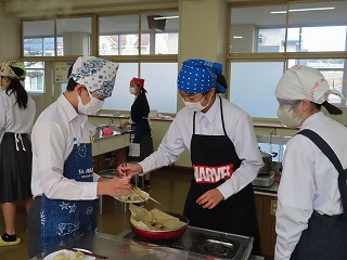 フライパンで調理する焼売を、心配で、何度も何度もふたを開けながら様子を見る男子生徒に対して、「ふたを開けすぎ!」という声をかける女子生徒。手際よく、「まな板洗っておいて!」「きれいに盛り付けしよ!」という女子生徒の声・・・。このように、「ほっこりとする様子」もありましたが、男子生徒も積極的に頑張って取り組んでいます!2組の授業には、みんなで一生懸命に頑張る雰囲気が調理実習からもしっかりと伝わってきます!みんながあたたかい雰囲気の中で、一人一人に役割があって、みんなで頑張っています!