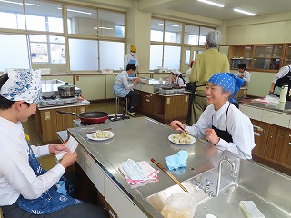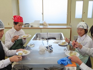 さあ、班ごとでの「いただきます!」の声。食材からみんなで協力をしてできあがった「焼売」と「はりはり漬け」。みんなで頑張ったからこそ、みんなで美味しく楽しく笑顔で食事ができるんだね!2組のみんな楽しそうでした!