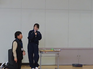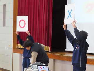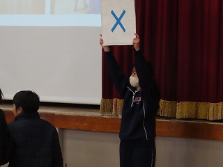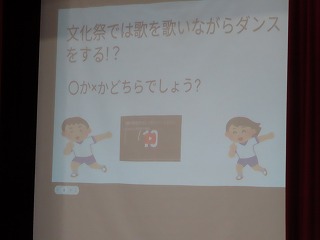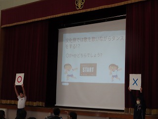 そのあとの〇・✗クイズも大盛り上がり!内容は「大池中学校クイズ!」です。大池中学校にかかわる内容がすべての問題でクイズになっています。例えば、「中学校のプールは、小学校高学年用プールの深さよりも深い?」などいうクイズです。小学校の子どもたちがに向けてのクイズです。小学校の子どもたちは正解するごとにガッツポーズをしたり、ジャンプして喜んだり・・・・みんなのステキな笑顔がいっぱいでした!