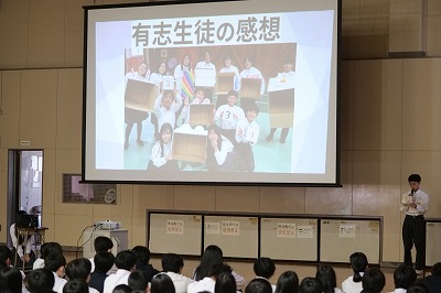 本日の還流報告会は、大池中学校生徒会が大切にしている取り組みです。今年度は生徒会役員と一緒になって有志ボランティアメンバーも全校生徒のみなさんにむけて、交流会の報告を分かりやすく可視化した資料をもとに発表をしてくれました。きっと今日の報告会を受けて、「来年度は自分も参加してみたい!」と思ってくれる仲間も絶対にいたと思います。それだけ、心のこもった報告会であったと思います。