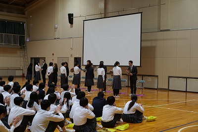 本日3月25日(水)1年間最後の授業。全校集会として2年生、1年生全員が体育館に集まり、生徒会本部役員が主体となった『三重県立特別支援学校 北勢きらら学園』との年間を通した交流会の還流報告会を実施しました。生活会活動の子どもたちが主体となる大切な取り組みの1つである「北勢きらら学園との交流会」。