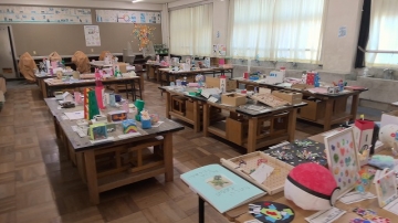 夏休み中に子どもたちが取り組んだ作品を「夏休み作品展」として展示しています。また、1学期の図工の時間に仕上げた作品は「校内図工展」として展示中です。