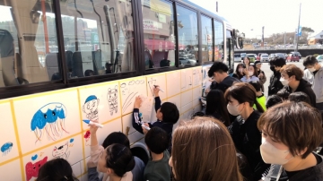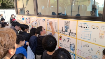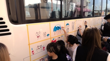初めに全体説明の後、各校の担当するバスの側面に分かれ、仕切られた個人用の側面に油性ペンで絵を描いていきました。