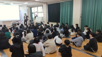 山手中学校から米川校長、内山生活指導担当に来校いただき、4月から始まる中学校生活の様子やルールなどについて事前講話がありました。