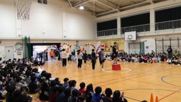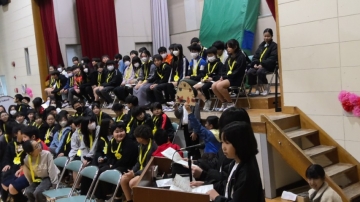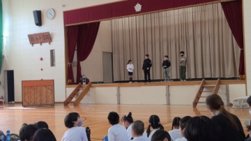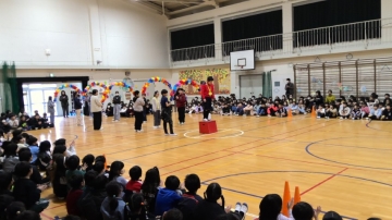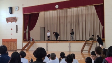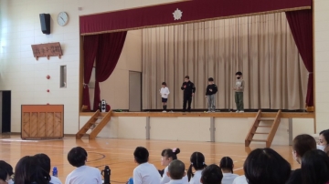 その後、各学年の出し物が始まりました。1年生から順に5年生までの在校生が出し物を6年生へ披露しました。どの学年の出し物にも工夫が見られ、6年生へのこれまでの感謝の気持ちと進学へのエールが込められていました。