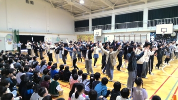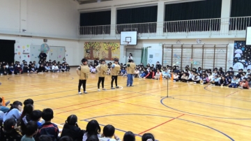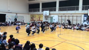 4年生からは、6年生が6年間を過ごした各年にブレイクした漫才、歌などを、複数で披露し、最後に全員で歌やおどりのプレゼントが送られました。