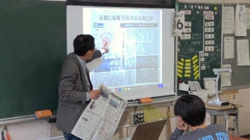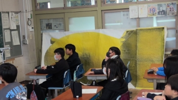 先生は爆弾の実物の大きさを示す大きな模造紙を持ち込まれ、大戦末期の学習の学び直しと、犠牲者を出したご家族の思いについて焦点化されました。