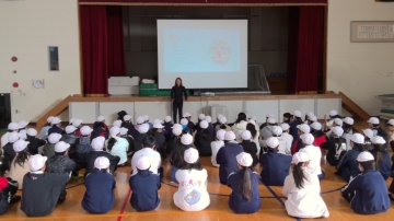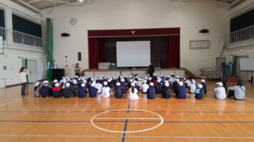 山根選手が体育館に登場すると、全員で待っていた6年生からは歓声の声があがりました。やはり、実際のアスリートを直接見ると、気持ちが高まります。