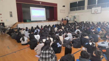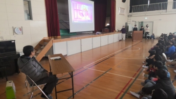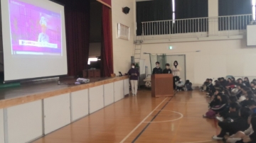 保健委員会と給食員会に所属する5・6年生が中心となって学校保健員会を計画し、運営を行いました。体育館に高学年の4・5・6年生が集まり、両委員会の友だちが調べた日常生活における歯磨きの仕方と食べ物に関する発表を聞きました。