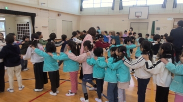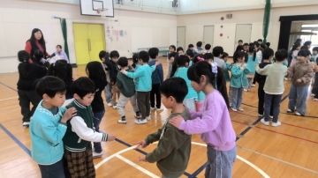 体育館に戻って、新1年生の自己紹介を行い、校歌後、じゃんけん列車をして遊びました。2回戦を行い、優勝したのは1年生でした。インタビューでも聞かれましたが、「とても楽しかった!」ようです。