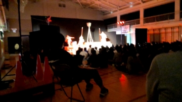 朝7時過ぎ頃から体育館内では、りんこ団員のみんさんによって、劇用の舞台準備が進められました。