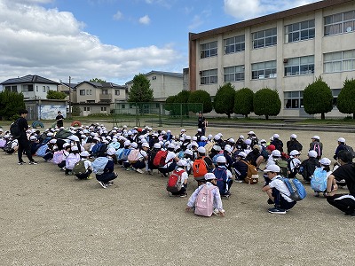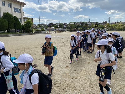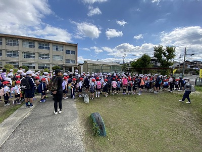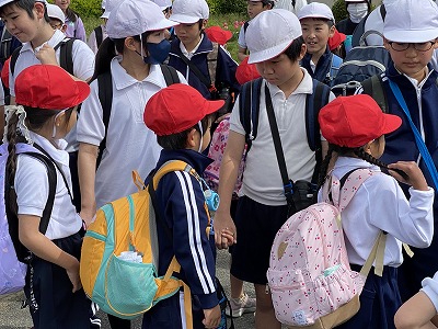 見送りの先生とハイタッチして、元気いっぱいの出発でした。