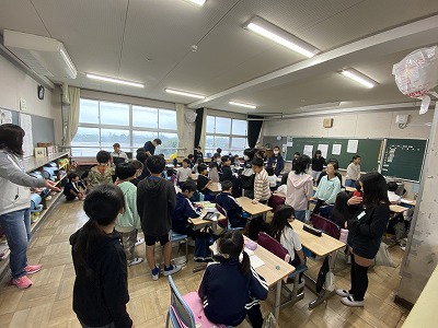 で一緒に活動をする5年生の友だちと、教室で顔合