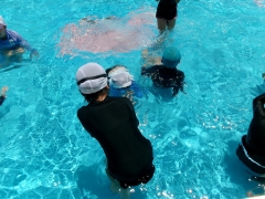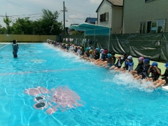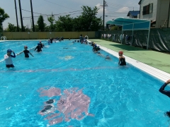2年生の水泳学習では、水になれるために歩いたり、もぐったりしています。水中ジャンケンでは、勝ったり負けたりで毎回大盛り上がりです。また、クラスや学年で流れるプールをつくるために歩いたり、走ったり、泳いだりしています。