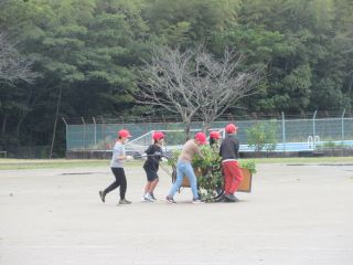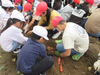 2・5年生では、事前に5年生がさつまいものつる切りをしていました。昨年度までは、先生方で準備をしていましたが、今年度からは、低学年が堀りやすいように高学年が頑張ってつる切りをし、掘りやすいきれいな畑にしてくれていました。