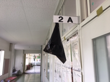 感染症拡大防止のために、換気を呼びかけています。しかし、この小山田小学校にはたくさんのツバメが飛来してきます。時には、廊下や教室に入ってきます。換気のために窓を全開にすれば、ツバメが校舎内を飛び交います。学級のプレートにカラスに見立てた黒い袋をつるしたり、防球ネットを設置したり対策を講じています。空調設備や扇風機を使い対応しています。
