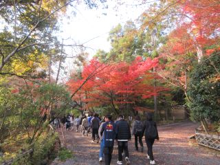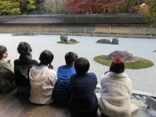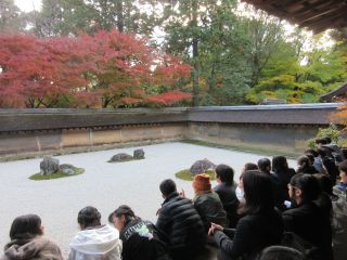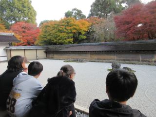 龍安寺では、静粛な雰囲気のなか、石庭などを見学しました。池の周りの紅葉もとてもきれいです。