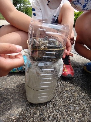結果は,石を入れたものは15秒くらいですべてしみ込み,下にたまったのに対して,砂を入れたものは5分経過しても5センチほどしかたまっていませんでした。土を入れたものは,5分経っても1センチもたまりませんでした!土を入れたものは,土を伝って早くしみ込むと予想していた子もいて,粒の大きさの違いでしみ込みぐあいがこんなにも違うことをおどろいていました。