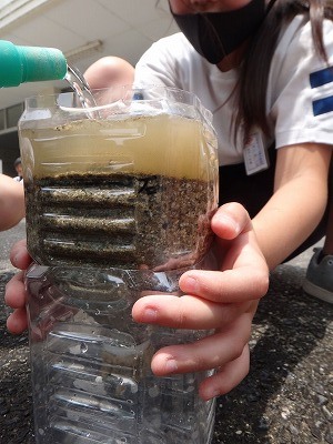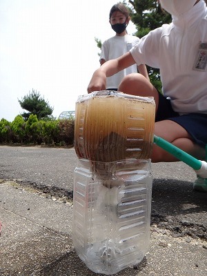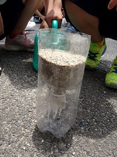 ペットボトルに石を入れたもの,砂を入れたもの,土を入れたものをつくり,水のしみ込み方を観察しました。