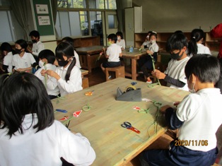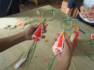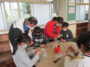 準備していただいた縄を使って,分かりやすく説明していただき,自分で作っていきました。子どもたちにとっては初めての体験でしたが,とても楽しそうに作っていました。出来上がったしめ縄はとても素敵で,子どもたちは大喜びで持って帰りました。きっとお正月にはそれぞれの家に飾られることでしょう。とても良い経験になりました。CS委員の方々,どうもありがとうございました。